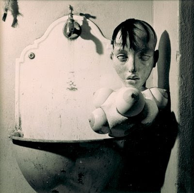 Totally creepy, intriguing, and in a way really beautiful in form and composition. The black and white is really effective - and the dolls themselves of course are sculpturally magnificent - Though subject matter is quite confronting, there's a lovely level of abstracted form in these images, and I understand why Bellmer chose to photograph his dolls rather than just present them as sculpture - the flattening and earie stillness is really what drives these shots for me.